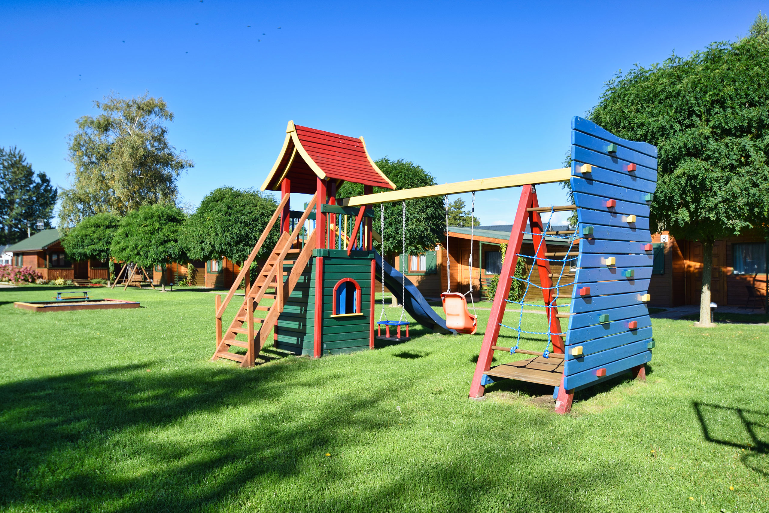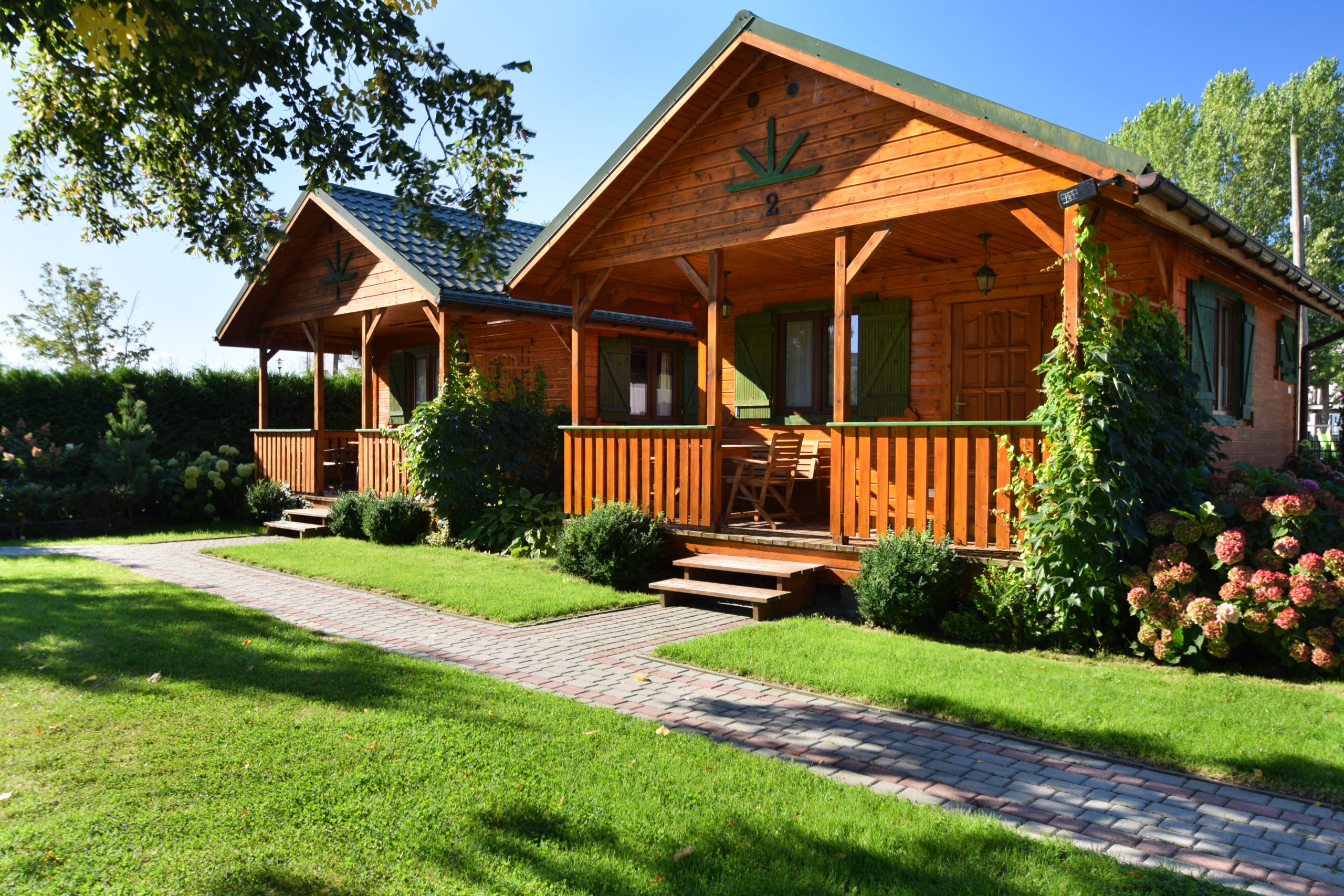 1 drewniany domek o pow. 32 m2 z dwiema sypialniami i tarasem o pow. 6 m2 przeznaczony dla 4 - 7 osób.