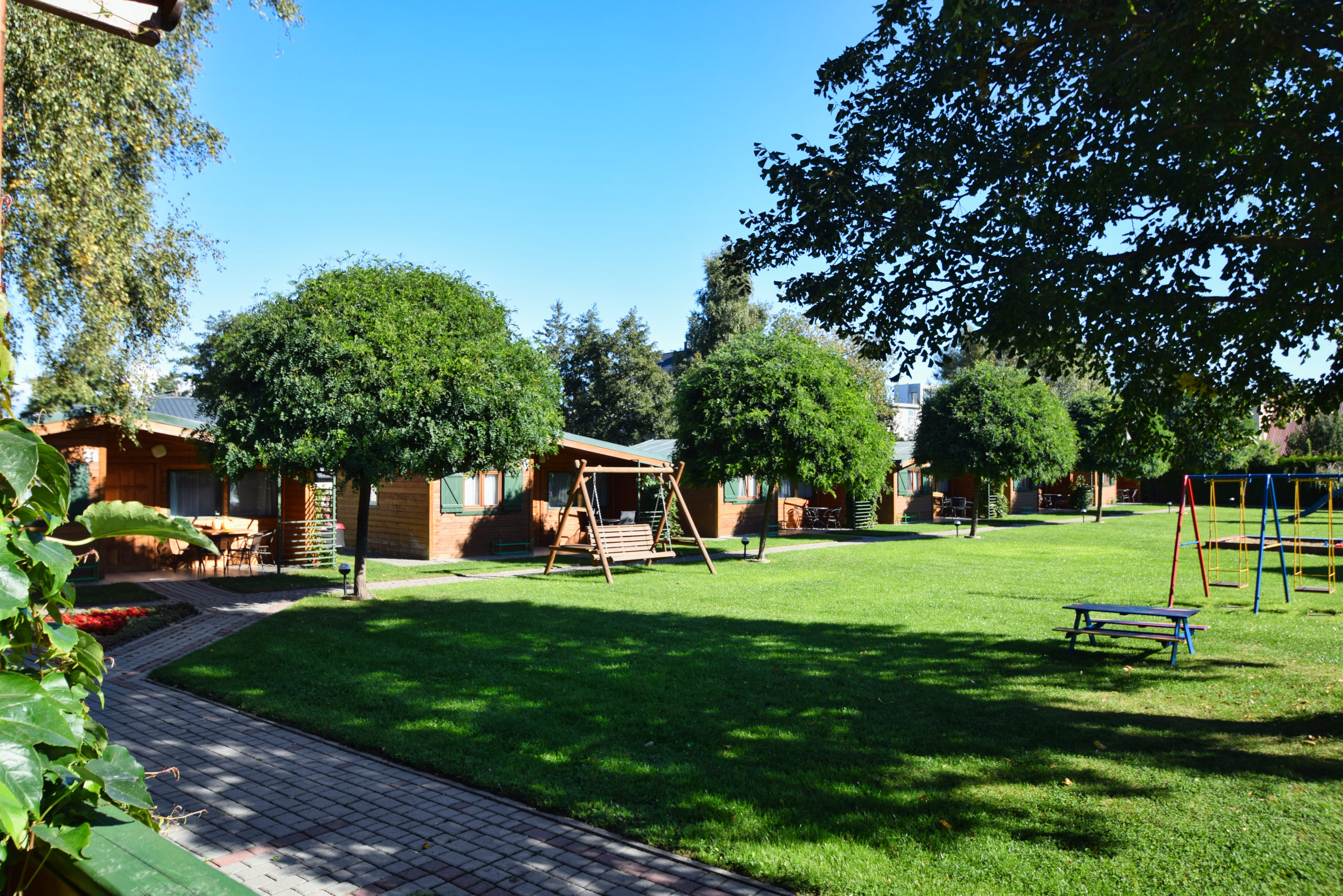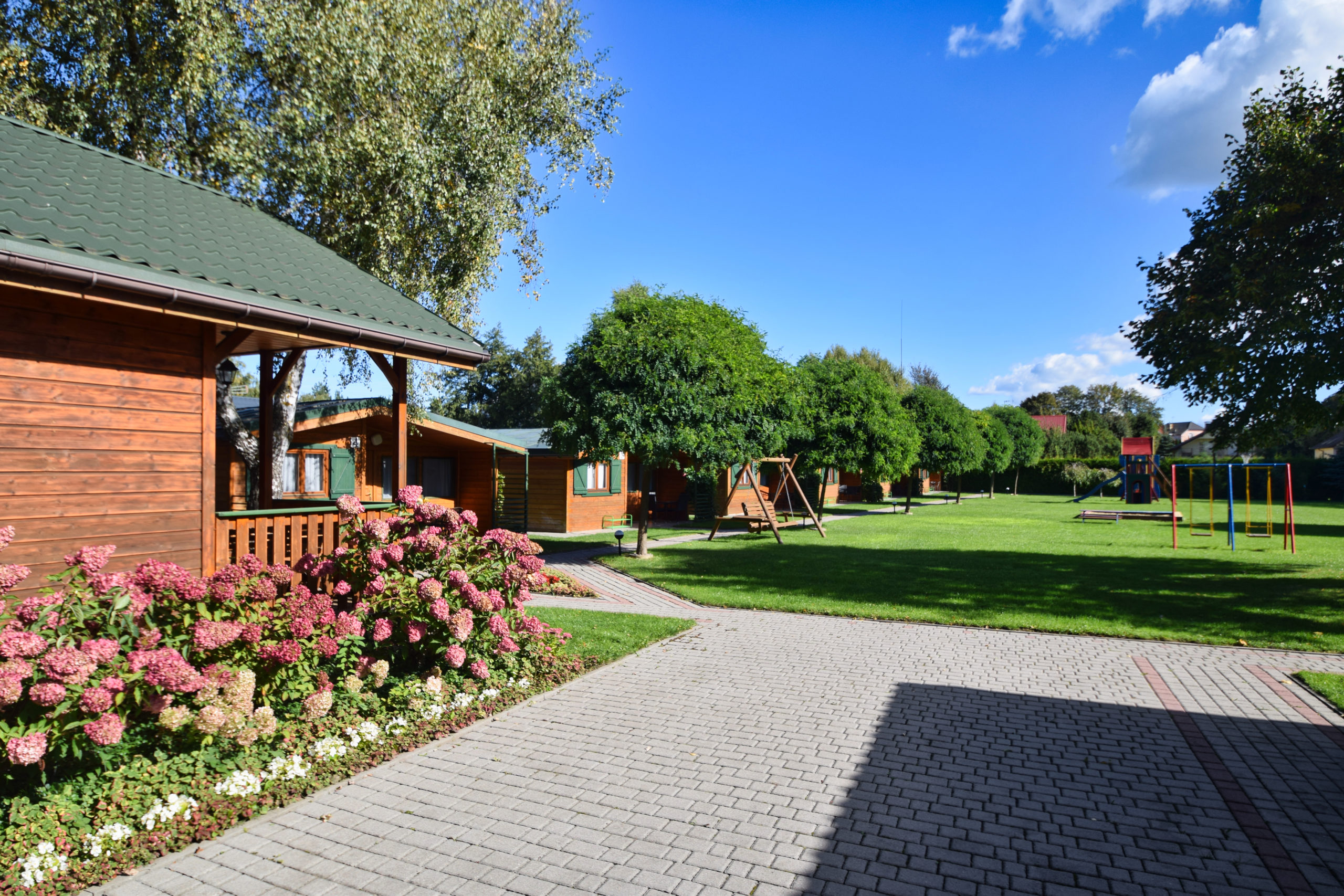 6 drewnianych domków o pow. 30 m2 z jedną sypialnią, tarasem, przeznaczonych dla 4 - 6 osób, bez schodów, progów i podestów.