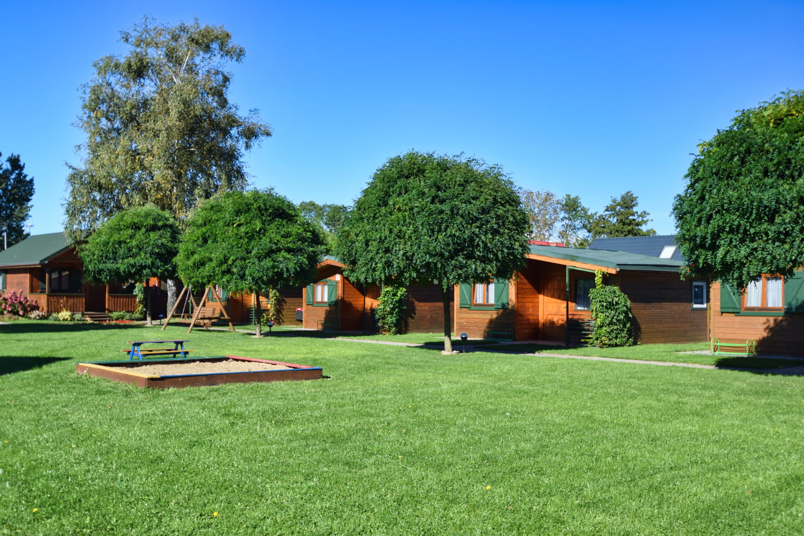 1 drewniany domek o pow. 32 m2 z dwiema sypialniami i tarasem o pow. 6 m2 przeznaczony dla 4 - 7 osób.